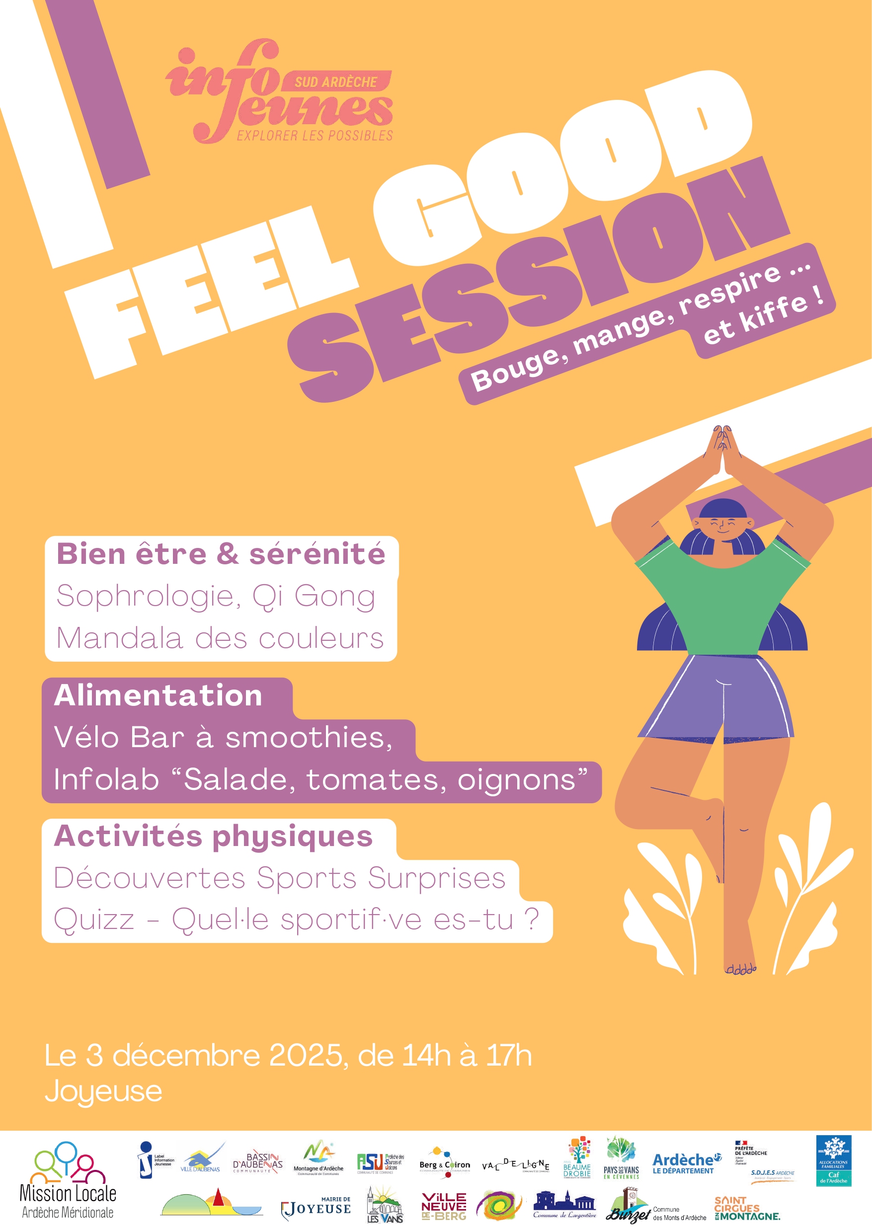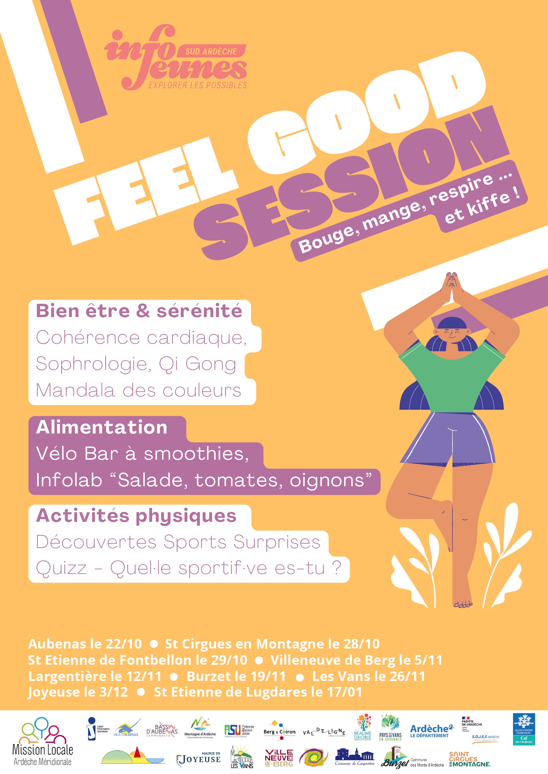 En partenariat avec les communautés de communes du sud Ardèche et la ville d’Aubenas, le service Info Jeunes Sud Ardèche et la Mission locale Ardèche Méridionale organisent entre octobre 2025 et janvier 2026, les Feel Good Sessions dans 9 communes du sud Ardèche (affiches imprimables en pièce jointe).