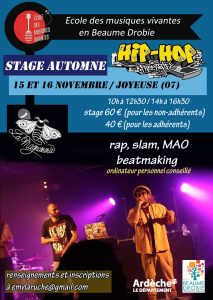 L’école de musique vivante propose un stage d’automne “Rap, slam, MAO, beatmaking” le 15 et 16 novembre à Joyeuses.