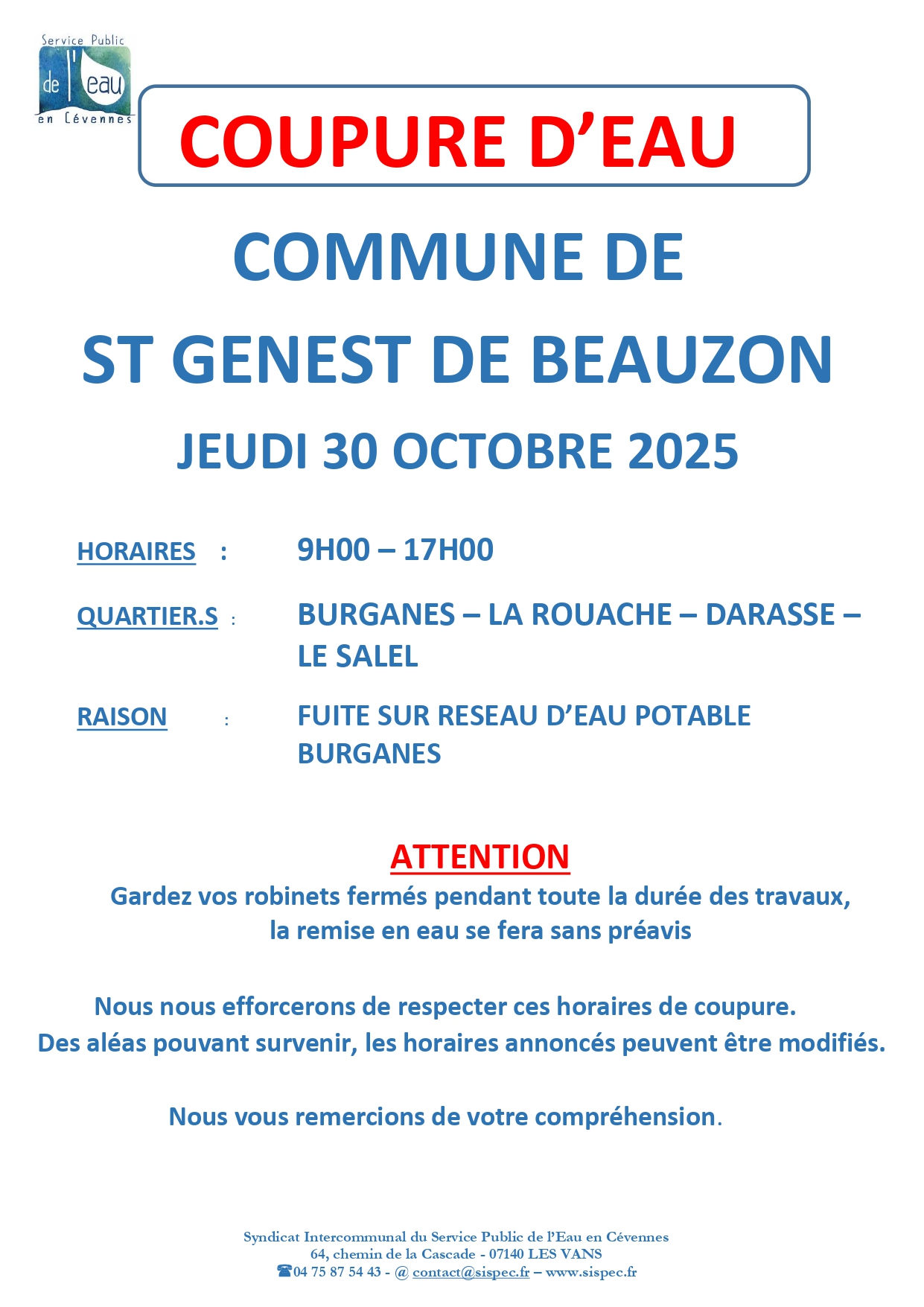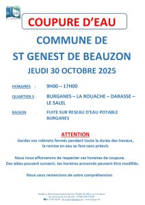 En raison d’une fuite sur le réseau d’eau potable sur la commune de St Genest de Beauzon quartier Burganes, nous vous informons d’une coupure d’eau le JEUDI 30 OCTOBRE 2025 de 9h à 17h.