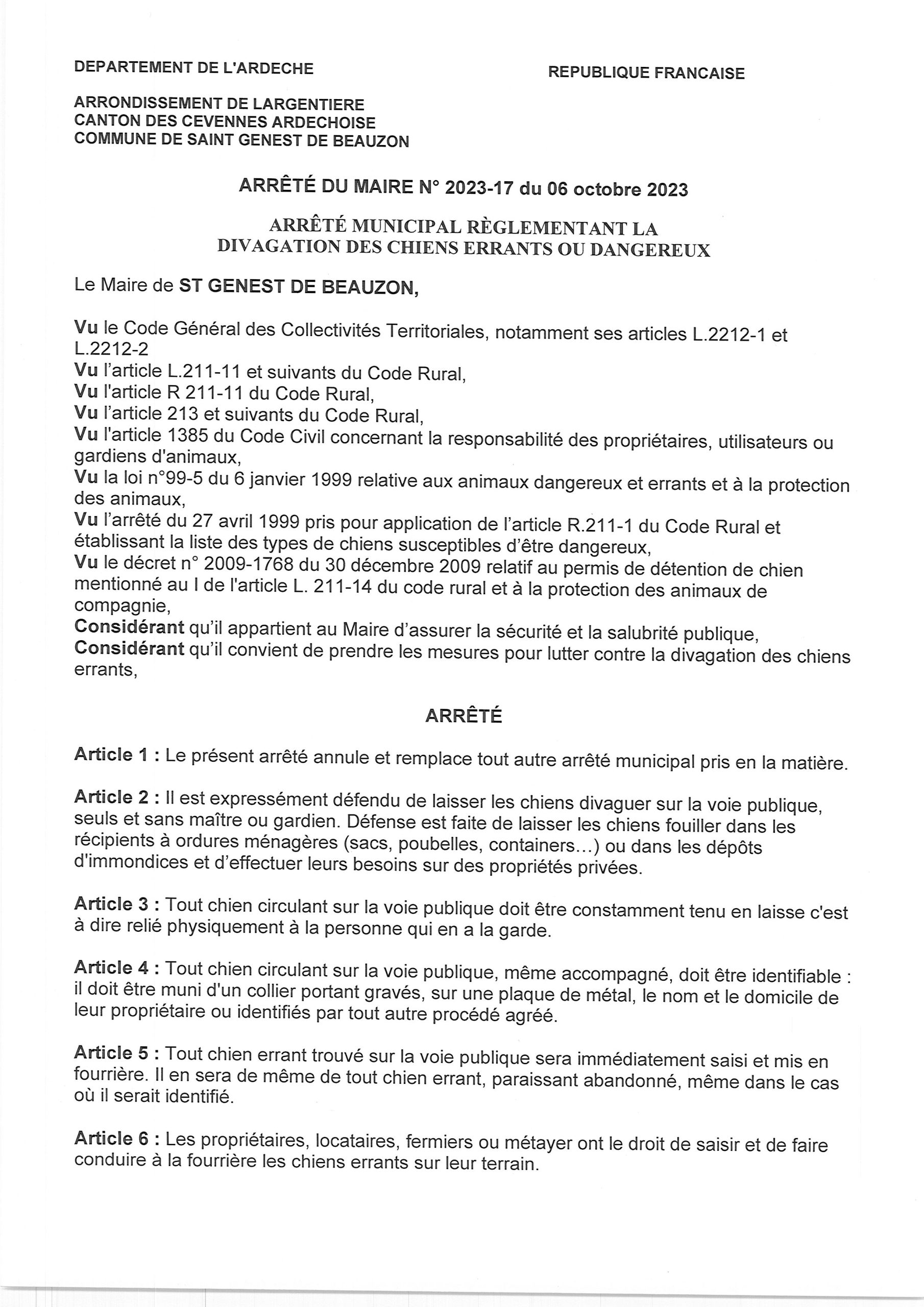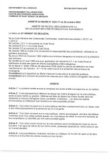 RAPPEL DE LA RÉGLEMENTATION RELATIVE A LA DIVAGATION DES CHIENS ERRANTS OU DANGEREUX.