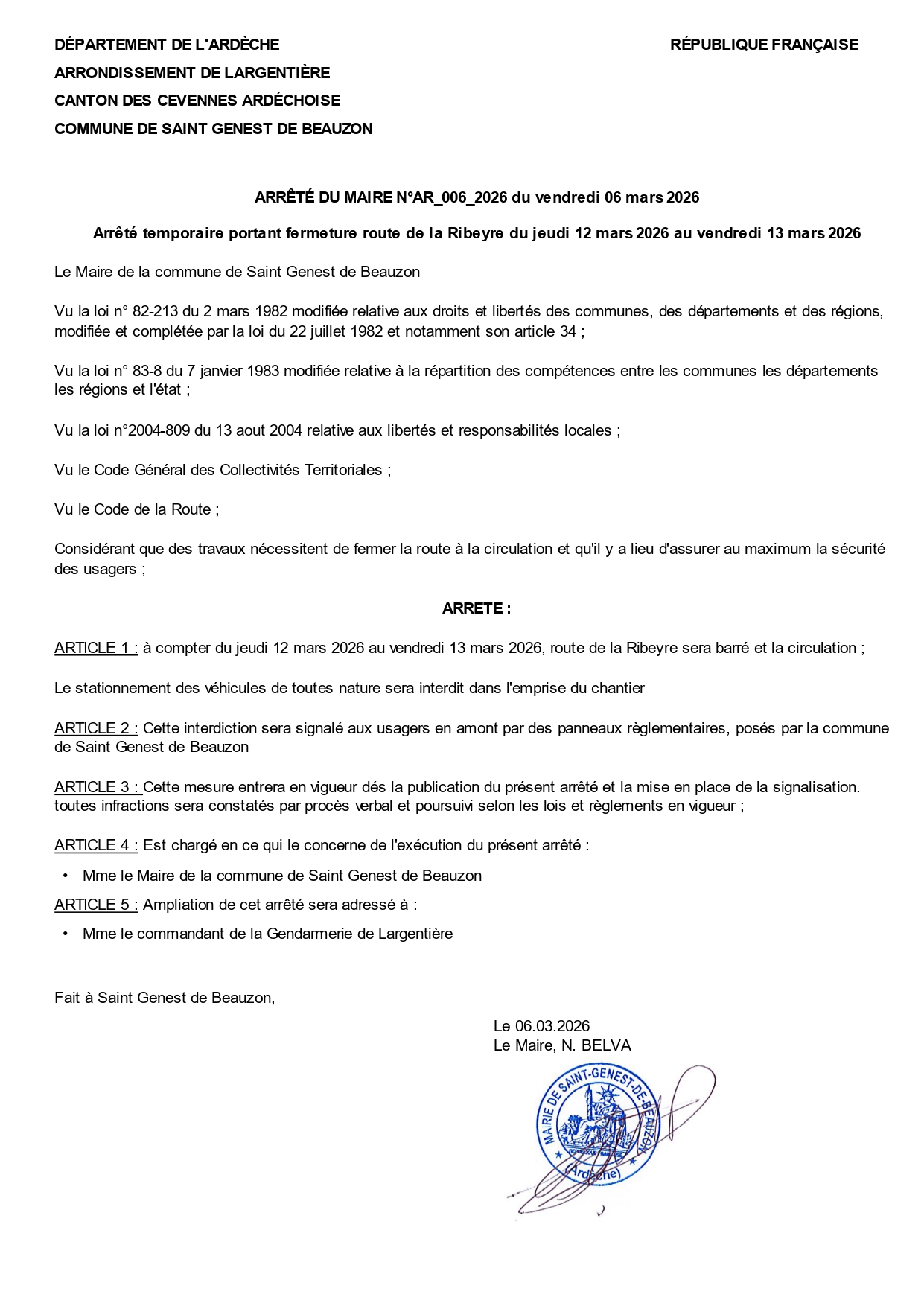 Fermeture provisoire de la route de la Ribeyre du 12 au 13 mars 2026 pour travaux de curage des fossés