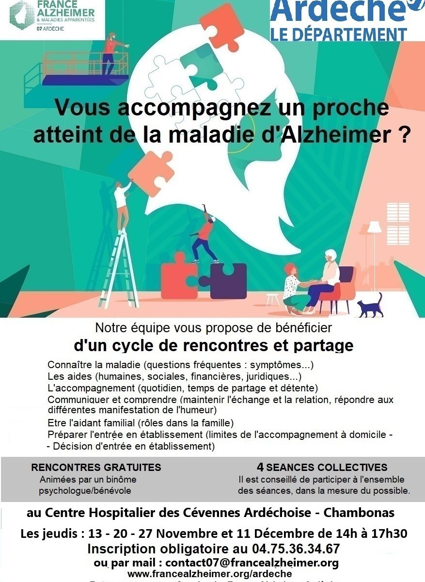 L’association France Alzheimer Ardèche propose  5 Formations gratuites des aidants pour le dernier trimestre 2025 sur 5 lieux différents :